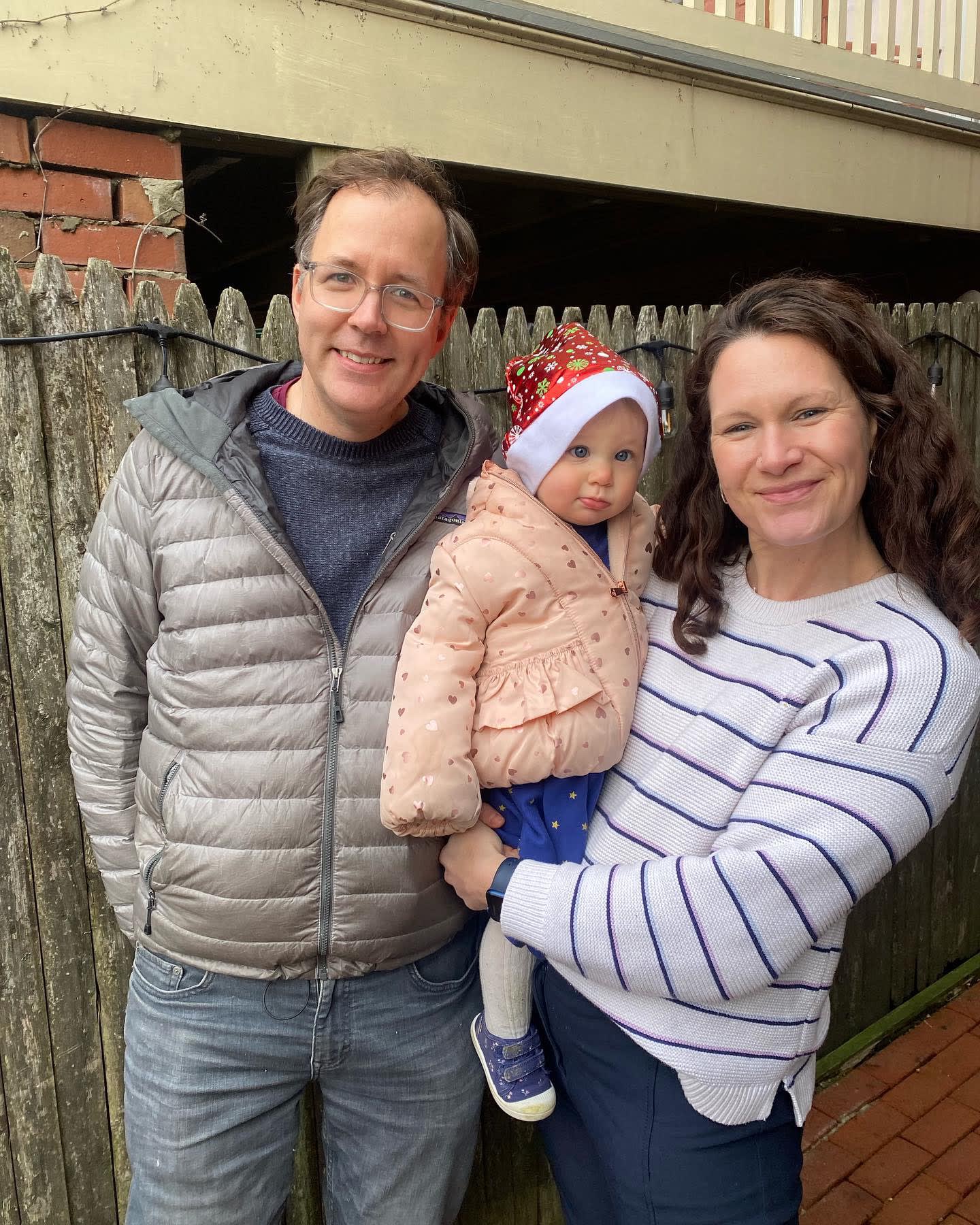 Celebrating with a Santa hat, courtesy her loving 3 year old sister.