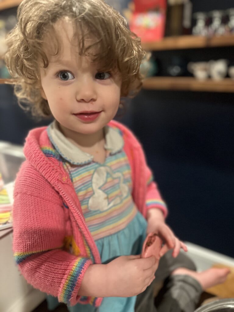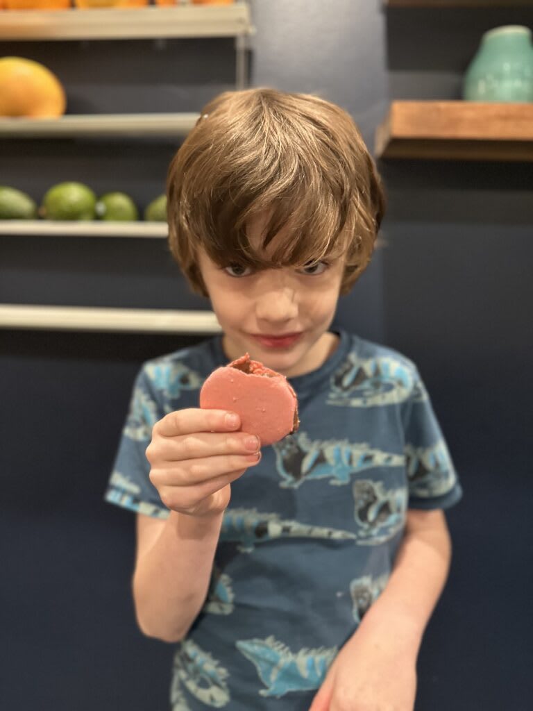 If you’ve watched the British Baking show, you’ve seen the silicon mats with pre-drawn circles. I don’t have one. I have parchment paper and shot glasses, which two seven year olds and a five year old laboriously traced, as many as they could fit on two sheets. But it was only in piping the batter the woeful inadequacy of my size estimation skills became apparent. A shot glass is, in case you haven’t learned the hard way, bigger than you think, and certainly bigger than the delicate morsels Steve was guiding me toward. To say nothing of the difficulty of coaxing even lines of perfectly traced circles out of the lovely group of helpers pictured below. They have so many other things to offer, but precision tracing, not currently a skill.