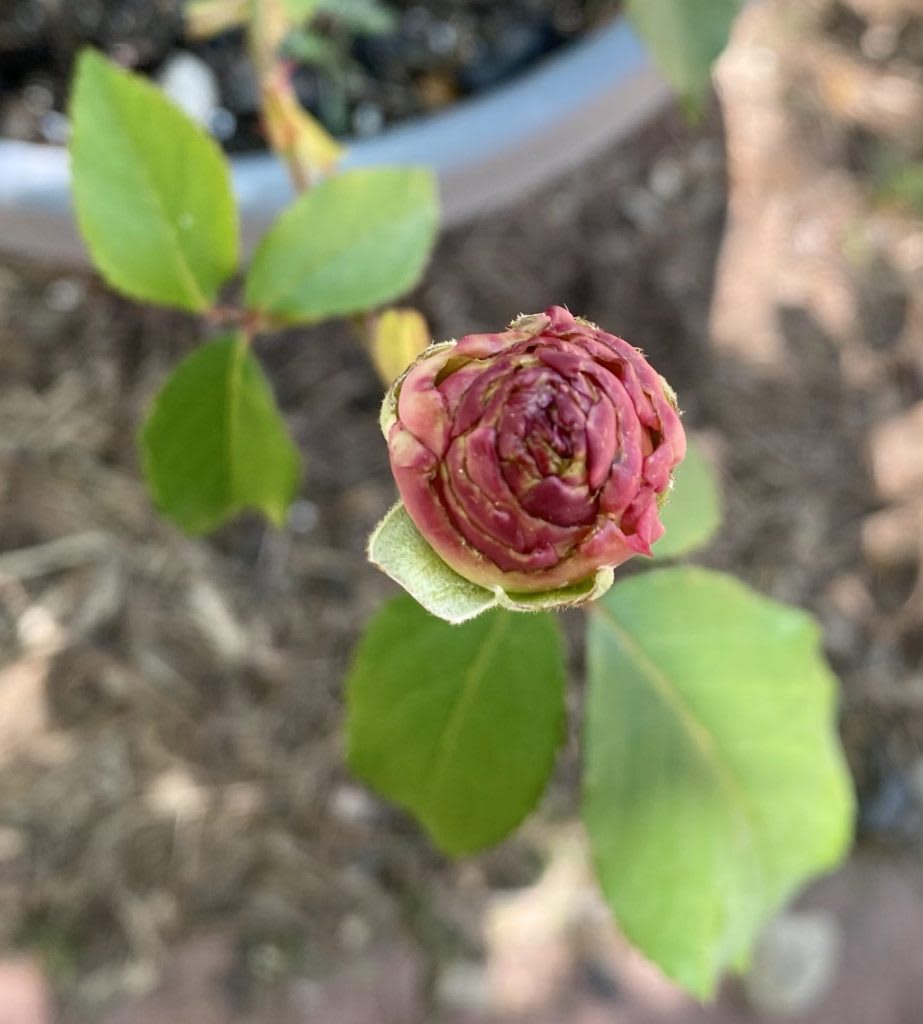 I get up close with the roses in preparation for fertilizing and things aren’t looking great. There’s black spot on a few of the leaves, per usual. Two of the roses have branches that look like they’re dying in real time, leaves curling into a fetal dried position from the outside in, and some leaves on the climbing rose seem dusted with powdered mildew. There are some deformed rosebuds–I don’t know what from–and one or two rosebuds-in-process have been snapped clean off by a wild creature or careless human. I even see some dreaded bright orange spots on the back of a few leaves, like my kid did a tiny Jackson Pollock with fluorescent paint. Rust! It’s oddly beautiful, but devastating for the plant. All these nasty fungal diseases are a constant menace for roses here; look it up and you’ll see the diseases thrive in “cool, wet, humid climates.” Textbook DC til it gets hot and humid, sometime in June. For now, the particularly long, cool, wet spring we’ve had would have been great for lettuce, had mine not been consumed by a raccoon, but it’s awful for roses. Roses would rather live in Arizona.