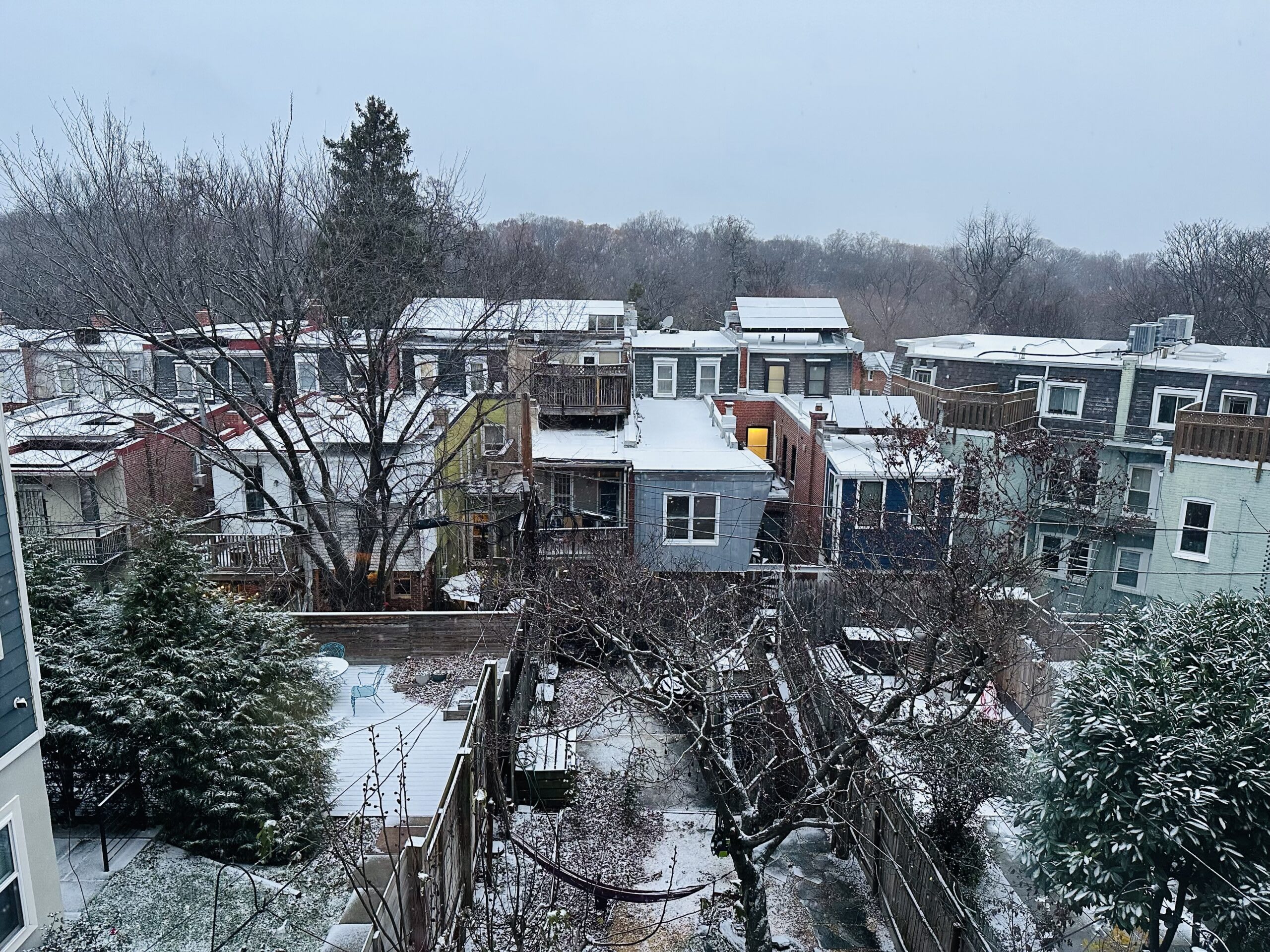 I’ve been distracted like a child by the promise of the winter’s first foray into snow. It’s not even snow the weather app promises, but sleet, known in my previous home of New York as wintry mix, name more romantic than the slushy reality. When I awake at 5:30 there’s nothing. But by the time I finish whatever prayer all that was, punctuated by a few raising of my head toward the dark, unmoving horizon, whose secrets remain locked within impenetrable blackness, and then, a few peeks at an app, as if the screen can better relay information about what’s outside my window than my own eyes, there’s a change. In the half hour that’s passed a thin white layer has descended on the opposite roofs, the neighbor’s deck. Not enough to cover the wind-blown leaf pile out back, curled up against all that tired old dirt we need to haul out to get a new fence in, but enough to disguise it, like powdered sugar over a cracked cake.