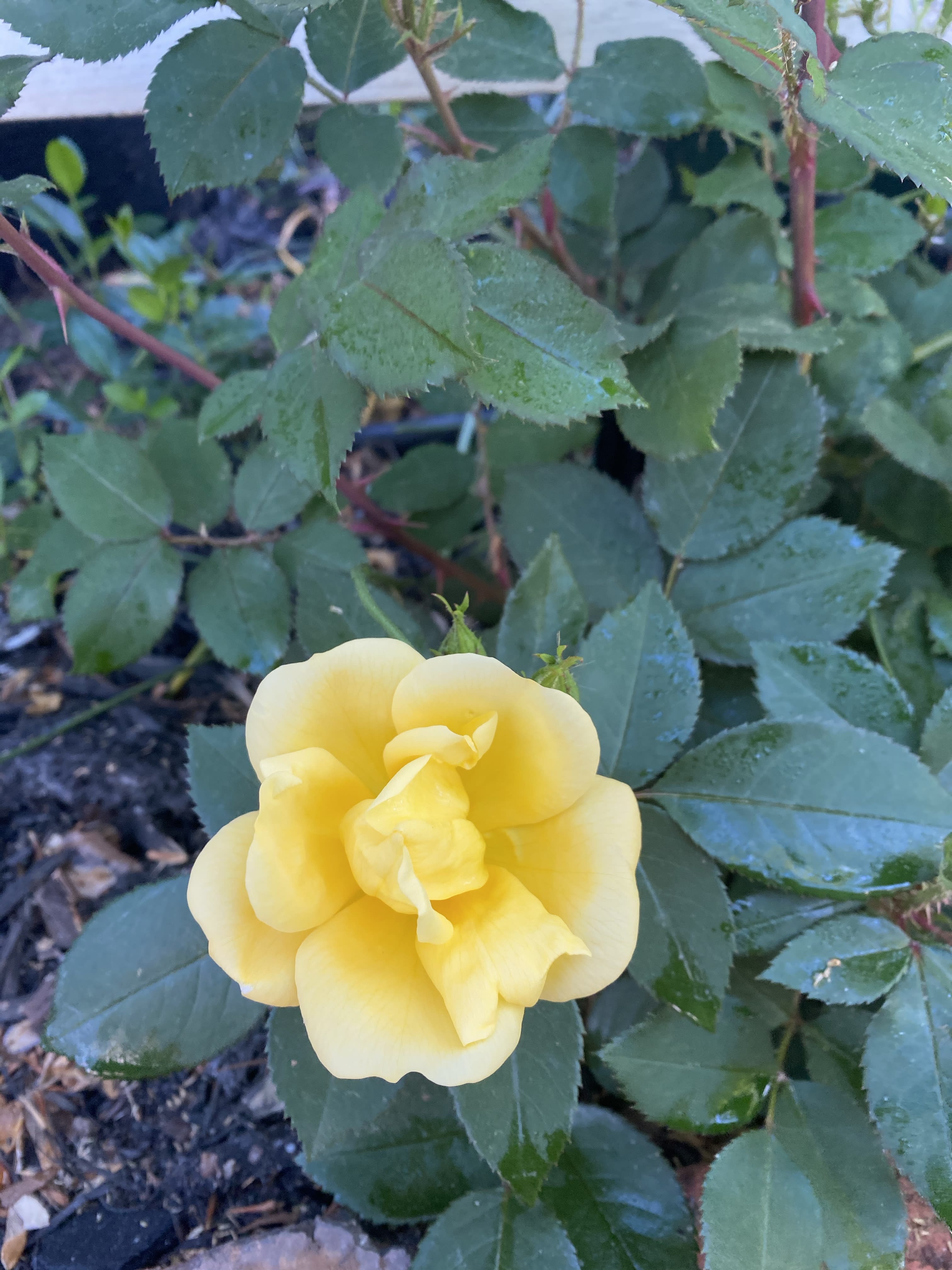 Angel Face, a spontaneous purchase from Home Depot on its last legs when I bought it. It was an ugly sight, but I loved the look of the rose on the label and for $4.99 I was willing to take a chance. I’ve been nursing it to health ever since. Last year, I was so proud of how healthy and full it grew in spring, dotted with the most lovely small purple blooms with a strong perfume. But come early summer, it got a bad case of black spot, a constant battle in DC’s humidity, then underwent a terrible drought while we were away for six weeks. Now it has only a single healthy cane remaining, probably worse than when I first bought it. I’m resigned that this might be the end of Angel Face, but not quite ready to write it off. As spring comes into full flush each year, I’m amazed anew at how a few short weeks can transform a rose from a few barren sticks to a proud stand of glossy leaves and fragrant blooms. This rose, more than any other, reminds me that what looks beyond saving may still find a way to generate life.
