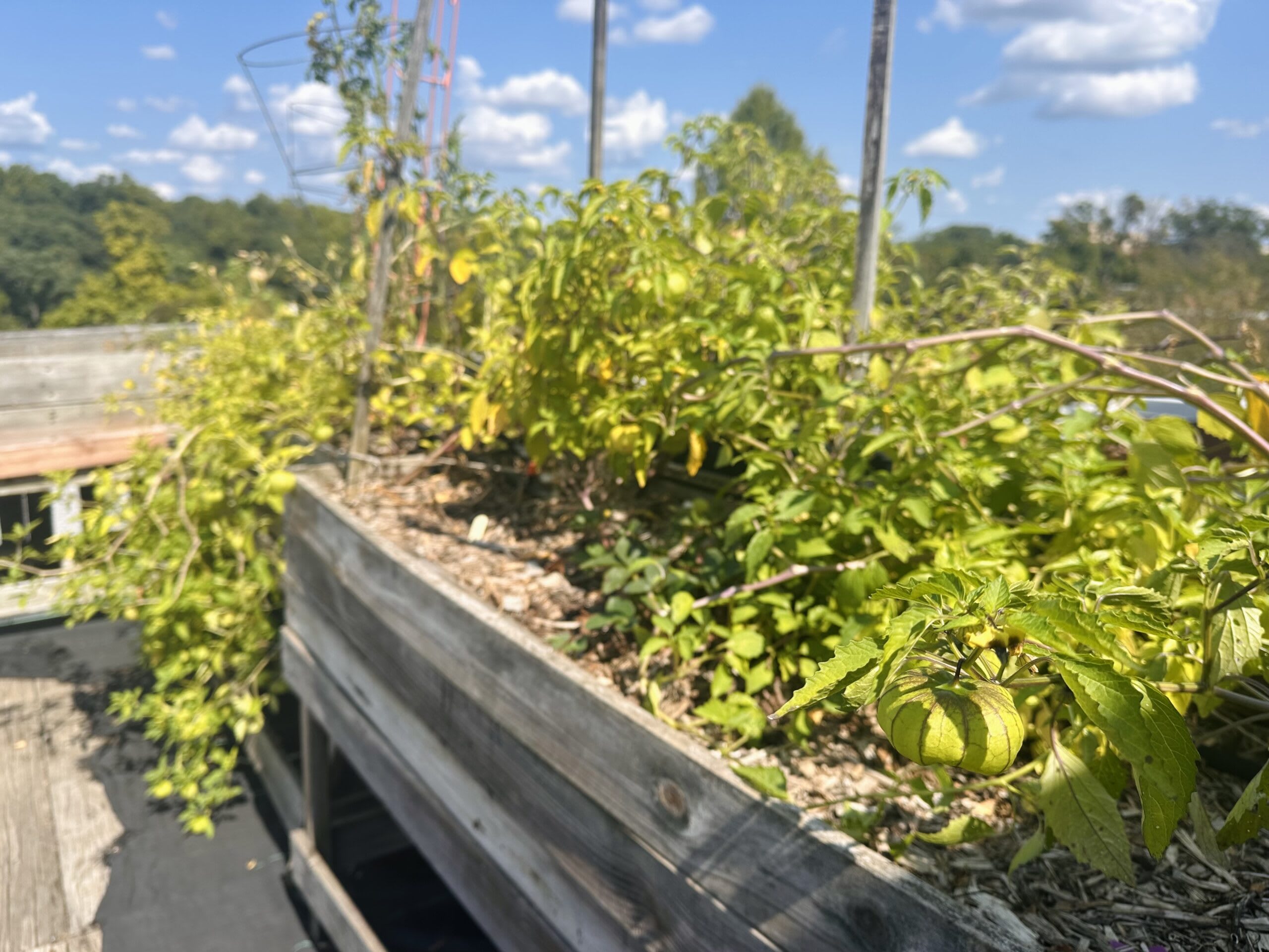But on the upstairs deck, which I’ve largely ignored this year, there must be ten tomatillo plants, branches heavy with abundance, laden with dozens of papery balls of tomatillo fruit bobbing like Christmas ornaments, bending gracefully over the old wooden raised beds, which themselves tilt from weight they can barely contain. The branches interlace as they grow, so the plants come to form a tomatillo hedgerow, individual plants largely indistinguishable.