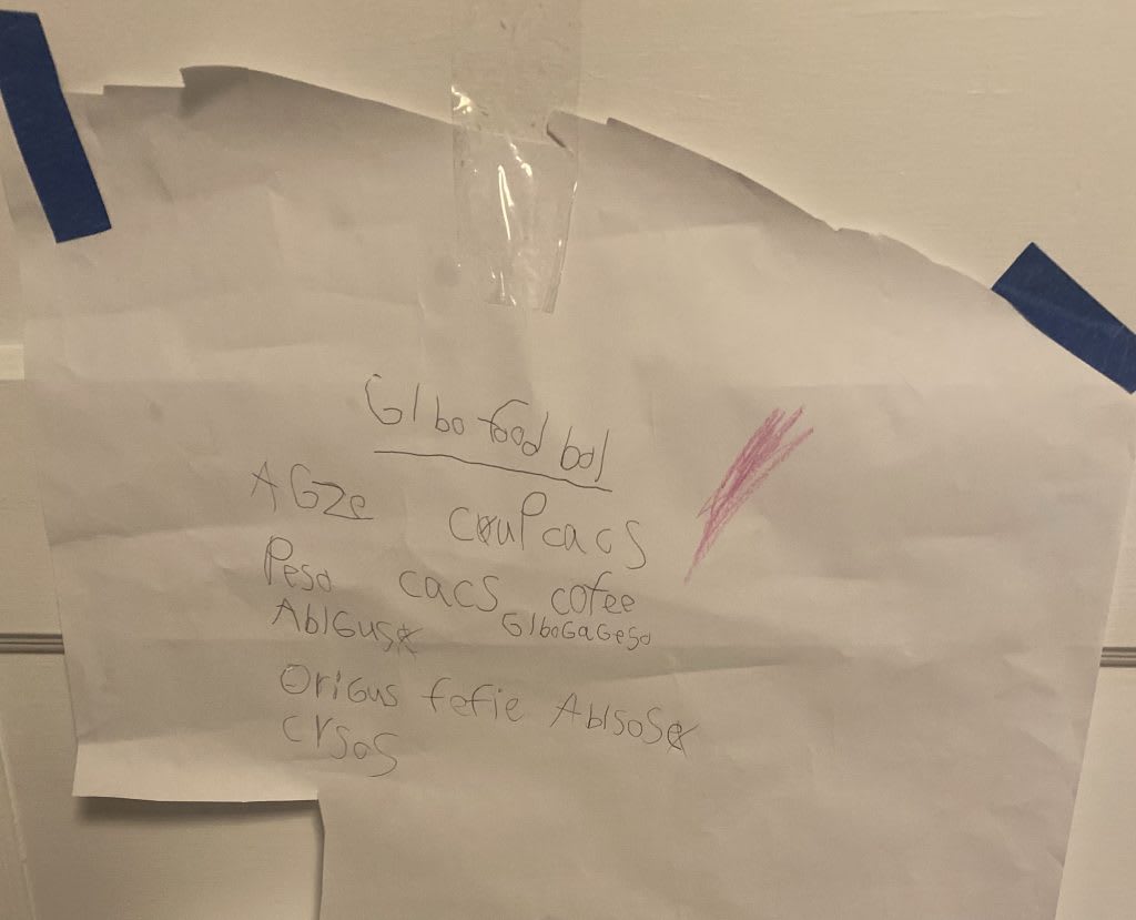 A couple weeks later we baby-sit a school friend, a few years older, and she leads them in writing out a menu for their restaurant, “Global Foobal.” They serve couPcacs and cofee; she makes me a delicious mochaccino. Without hysterics, without any prodding from me, imaginative play is happening.